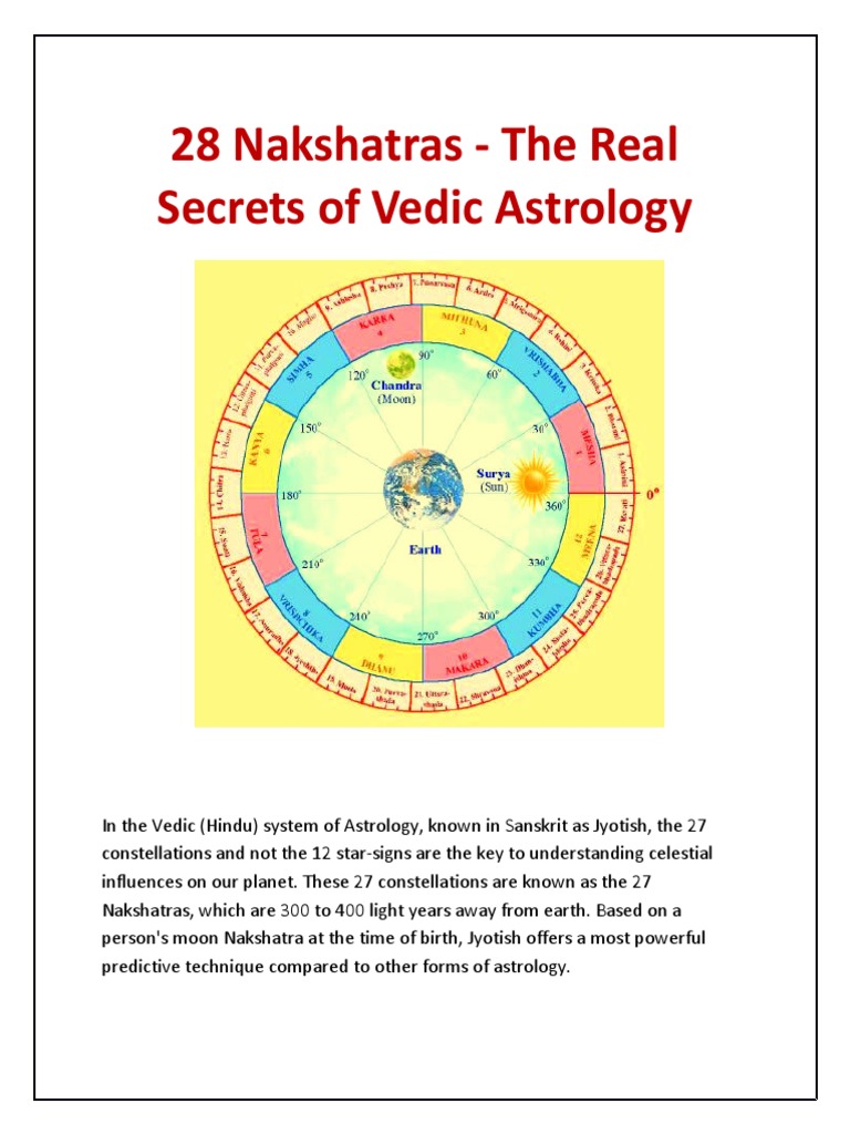 PDF KEY TO THE 27 NAKSHATRAS - VEDIC BIRTH STARS - Anandashree Astrology WHAT IS A NAKSHATRA? Superimposed over the 12 signs of the Zodiac, are 27 star constellations that hold great symbolic meaning for Vedic Astrology. These 27 sections of the sky -- the Nakshatras-- comprise the Nakshatra Wheel. The star constellations within and close by these sections are the Nakshatras. In Indian mythology, the Nakshatras ...