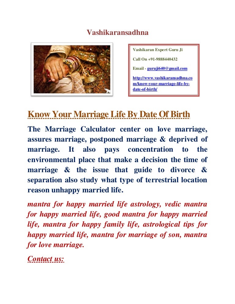 Marriage Prediction by Date of Birth, When will I get 21/09/2021 · Based on ancient Vedic marriage astrology, our marriage calculator offers a detailed marriage horoscope by date of birth that covers all sorts of marriage predictions such as love marriage prediction, marriage age prediction, marriage life prediction and much more. Get free astrology predictions for marriage! Marriage Astrology - How Will Be My Married Life? - Outlook Getting married, getting married to the person of liking, and then maintaining a marriage are all issues that crop up in one's life one after the other. Dr. Vinay Bajrangi, the best astrologer,... Marriage astrology and predictions explained by top astrologer in India ... After all, astrology can tell you everything about your future, including how your married life is going to be. Different aspects of your Birth Chart or horoscope can tell you everything about ... Happy Married Life in Astrology - Vedic Raj Astrology (for all Ascendant) Happy Married Life in Astrology by Vedic Raj Astrology (Secret Level 14 Points) > Venus Condition :- Venus plays most important role in love relationship & marriage life. In male chart venus represents wife as well as female & in female chart jupiter represents husband, so in your birth chart you've to find out 1st venus condition (venus PAC ...