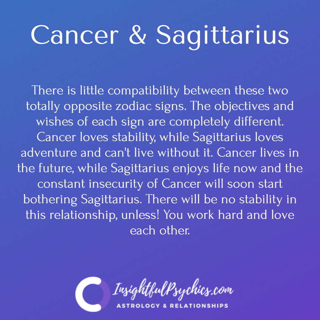 Cancer and Sagittarius Compatibility In Love, Friendship & More - VedicFeed Cancer and Sagittarius in love can have a mixed bag of results. These two horoscope signs can be compatible because they are both loyal, honest, and have a lot of integrity. However, it is not unusual if they happen to fall in love with each other. Cancer can be quite moody and emotional, while Sagittarius is more carefree and fun-loving.