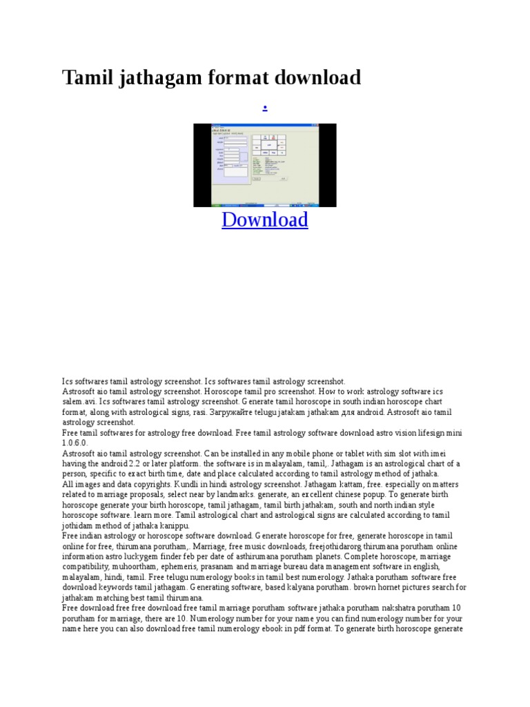 Jyothishya Software FREE Download | LifeSign Mini® 1.2 Read more English, Bengali, Oriya, Telugu, Tamil, Marathi, Kannada, and Malayalam. LifeSign Mini free astrology in Kannada generates the jataka in Kannada, in your preferred regional chart styles viz. South Indian, North Indian Kerala, and Bengali. Free Tamil Jathagam Software Dowload | Download LifeSign LifeSign is available in 9 languages - English, Tamil, Hindi, Bengali, Telugu, Marathi, Kannada, Malayalam & Oriya. Panchangam Predictions The basic birth details of the individual based on Panchangam – weekday, tithi, nakshatram, karanam and nithya yogam. Download malayalam typing software 64 bit for free (Windows) The free astrology software LifeSign Mini lets you generate any number of horoscopes. You can generate horoscope reports for you and your dear ones. ... astrology software LifeSign Mini ... the software guarantees ... , Kannada, Malayalam and Oriya ...