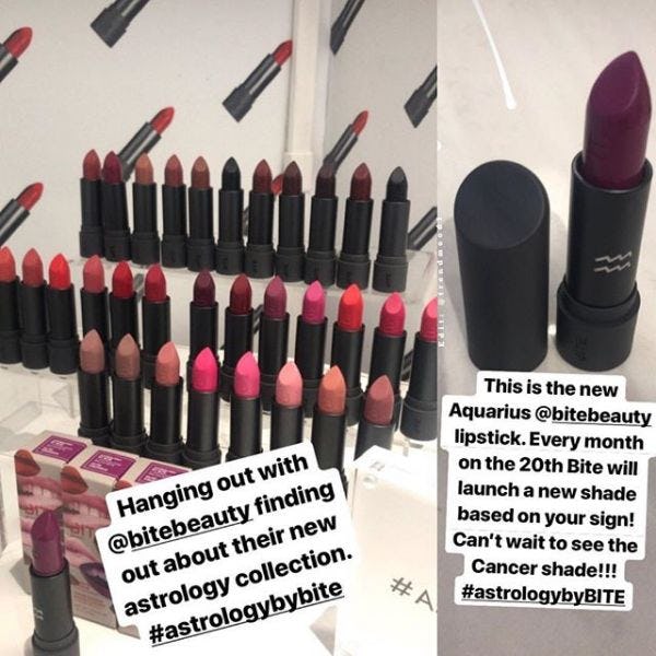 Bite Beauty's new line of astrological lipsticks | Well+Good The line's Amuse Bouche-size zodiac lipstickcelebrates each month's star sign, and January's Aquarius hot ticket is a vibrant berry shade with a satin sheen finish. The color was inspired by...
