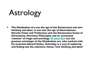 Elizabethan Era Astrology by Bryan Yang - Prezi Elizabethan Era Astrology Astrology Many astrologers in the Elizabethan era believed that the stars and the planets could tell the future. Astrology was linked more closely to the supernatural rather than science. Interest in astrology spiked during the Elizabethan Era. Many famous astrologers such as Dr. John Dee emerged out of this time period.