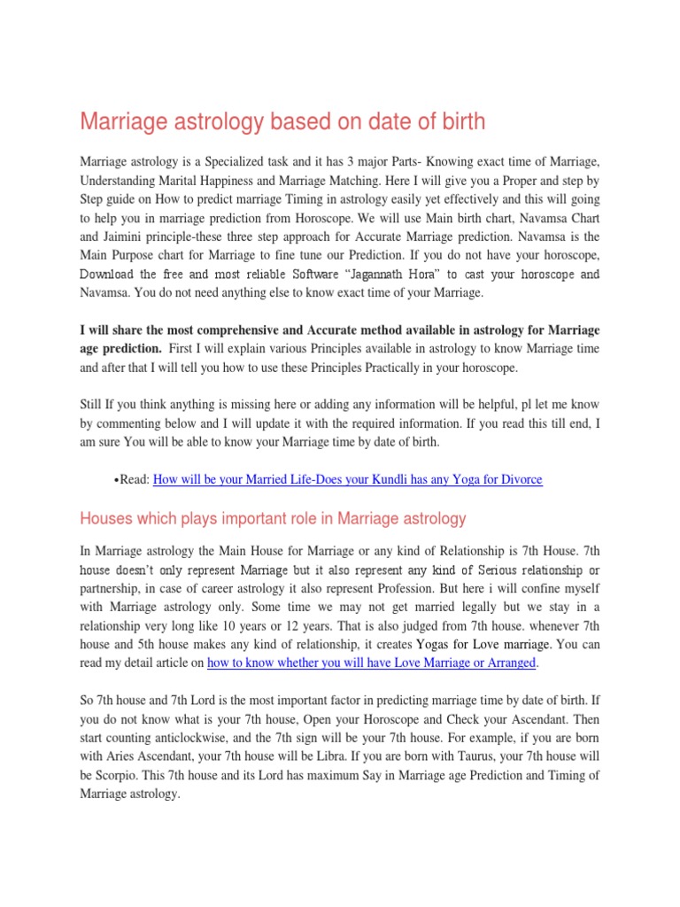 Marriage Time Prediction from Date of Birth-3 Best Methods to Read ... The 3 best Methods which will help you to Predict the Accurate Marriage date of any Person from Horoscope are Vimsottari Dasha Method Chara Dasha Method Transit or Gochar Method But We have to use all of these 3 Methods Together for Accurate Results. If you use one or Two Methods but Skip the others, the Predictions can go Wrong.